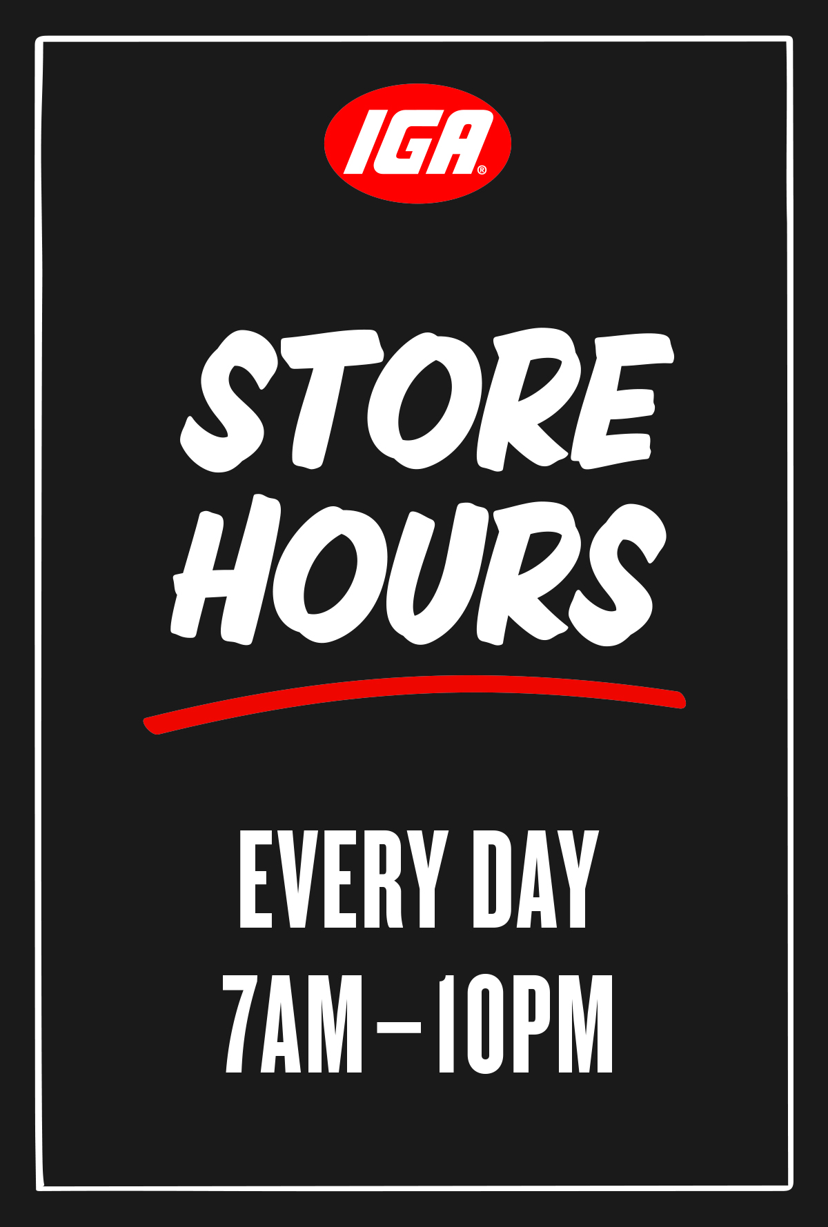 We will customize your window sign with your IGA store’s hours. Window signs are 30″ x 44″ and printed on sturdy cardstock.